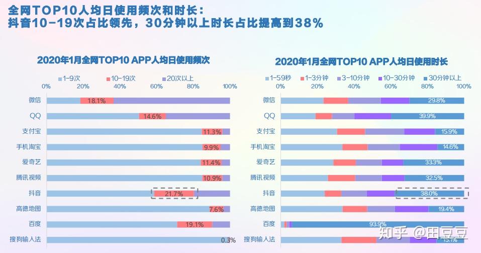 其中抖音日打开10~20次的用户占比为21.7%使用30分钟以上的用户占比为38%。