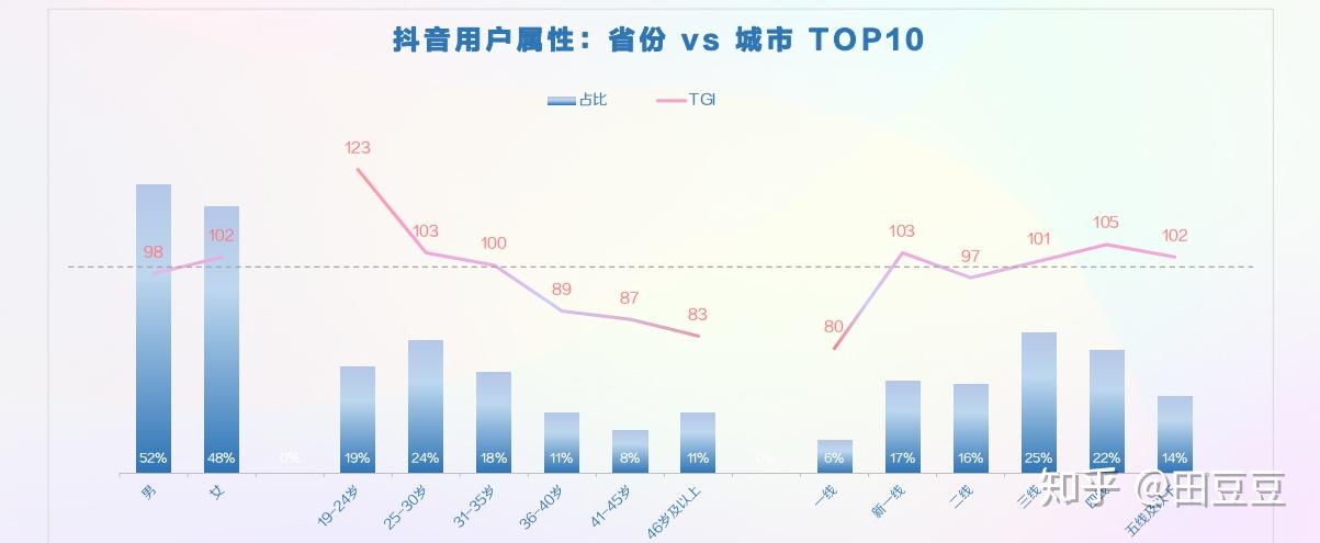 抖音整体用户男女均衡,未出现比例严重不均的情况,其中以新一线及三线包括以下城市人群占比最高。